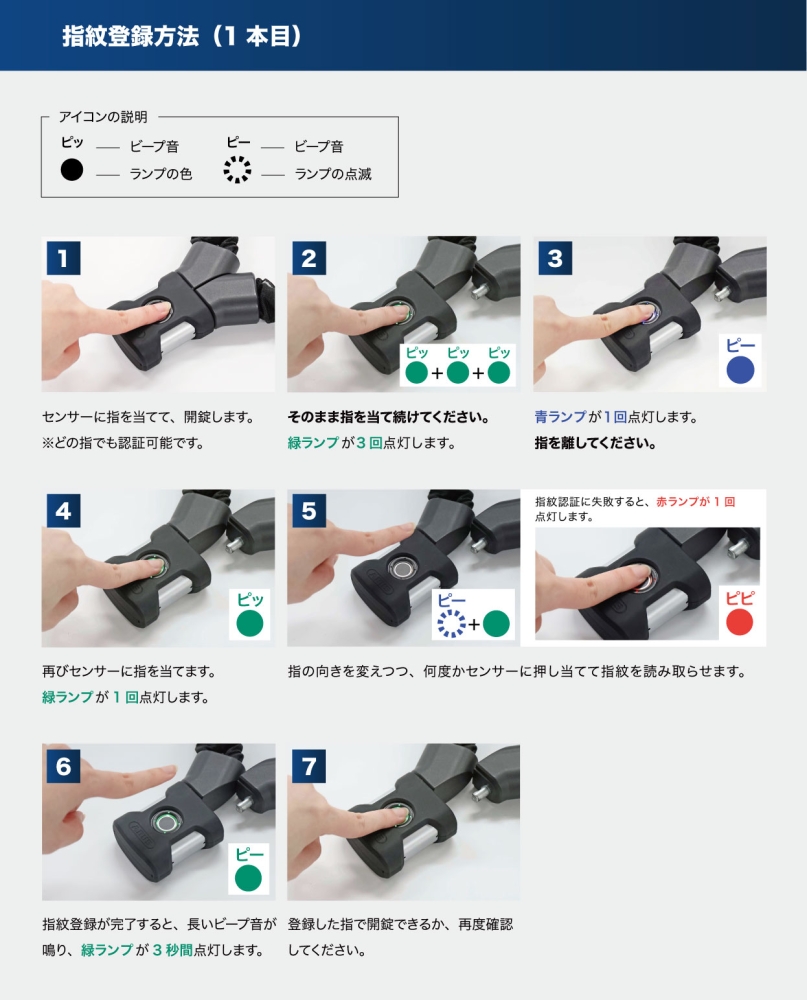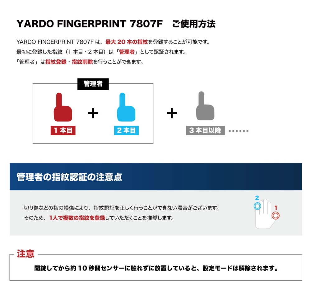指紋の登録方法(1本目と2本目は管理者となります)